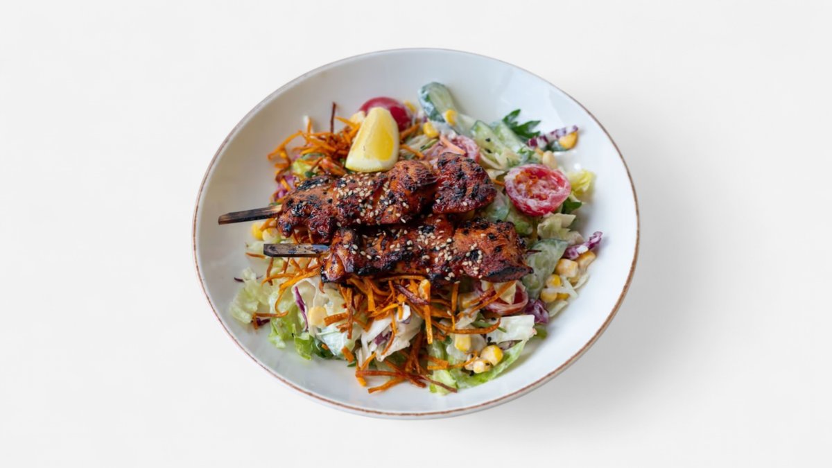 Mixed greens with cherry tomatoes, cucumber, sweet corn and radish, tossed in a light yogurt dressing, served with marinated chicken skewers. 393 kcal P: 46g, C: 9g, F: 14g