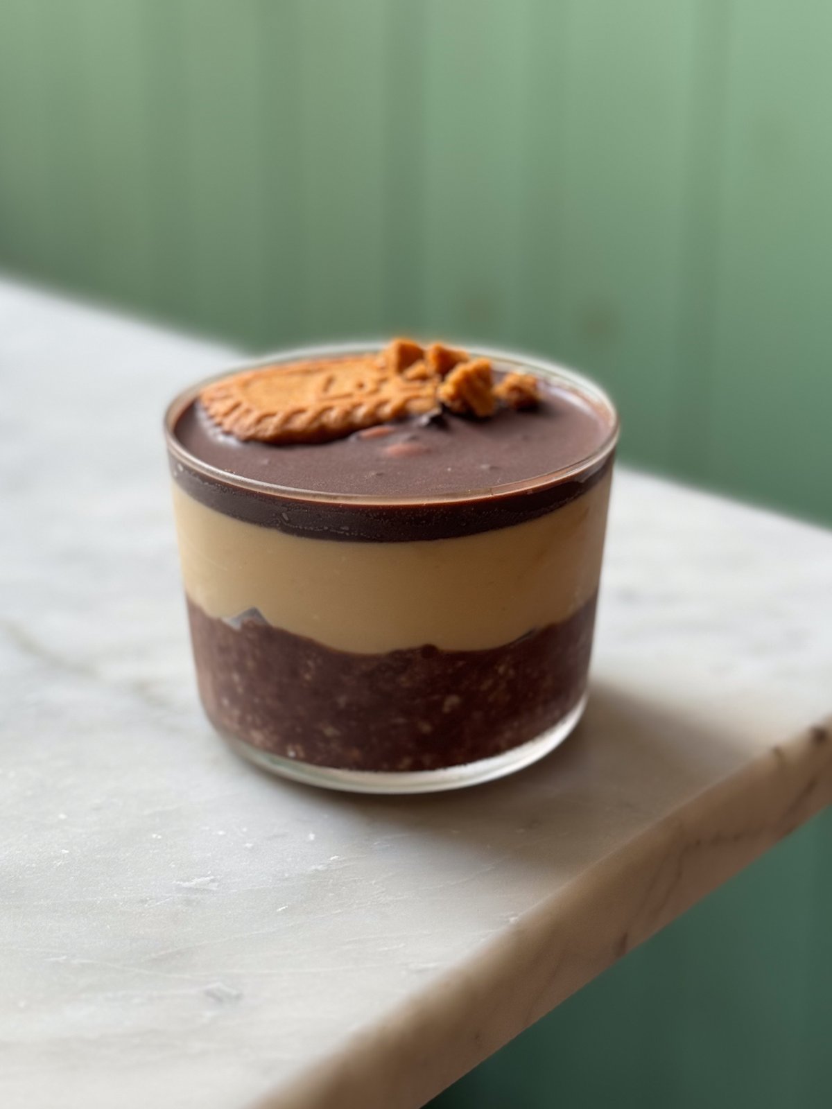 A blend of banana, peanut butter, coconut mIlk, topped with an inhouse peanut butter and chocolate chip cookie