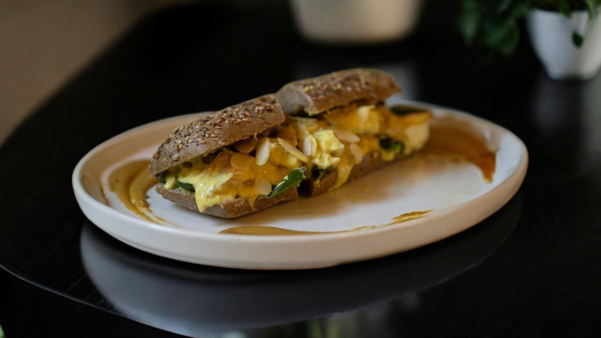 A dairy free yoghurt infused with garlic and dill, poached eggs, chili oil, herb oil and a side of sourdough
