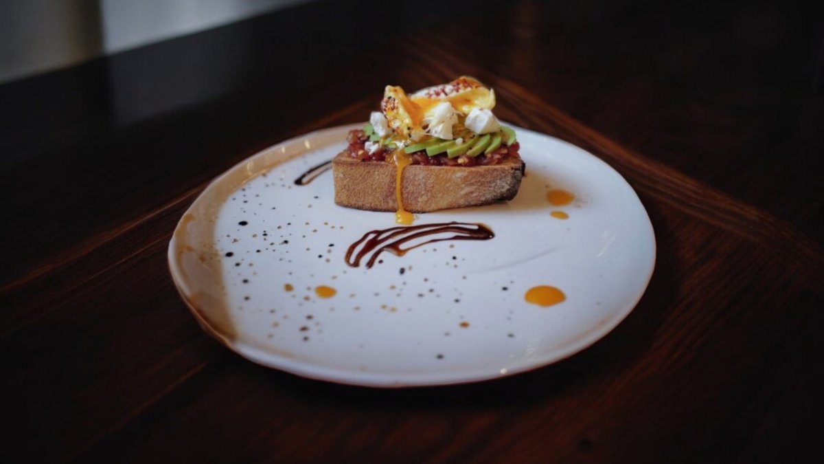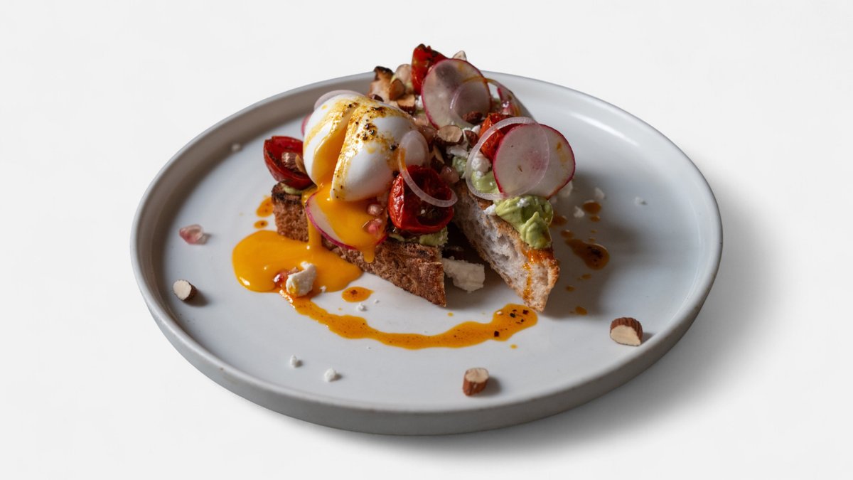 poached egg, goats cheese, avocado cream, radish, pickled onions, roasted cherry tomato, sesame seeds, chilli oil and crush almonds on sourdough.