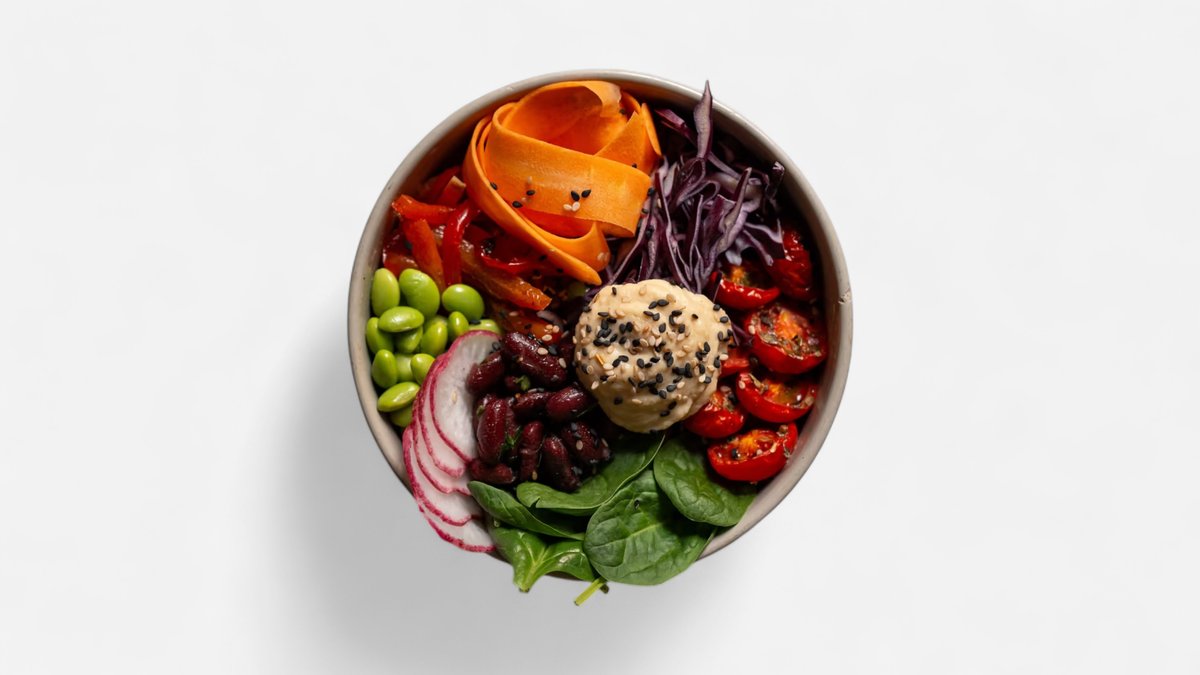 Spinach leaves, roasted cherry tomatoes, carrots, red cabbage, avocado, radish, edamame beans, marinated kidney beans, roasted pepper, topped with a roasted garlic hummus.