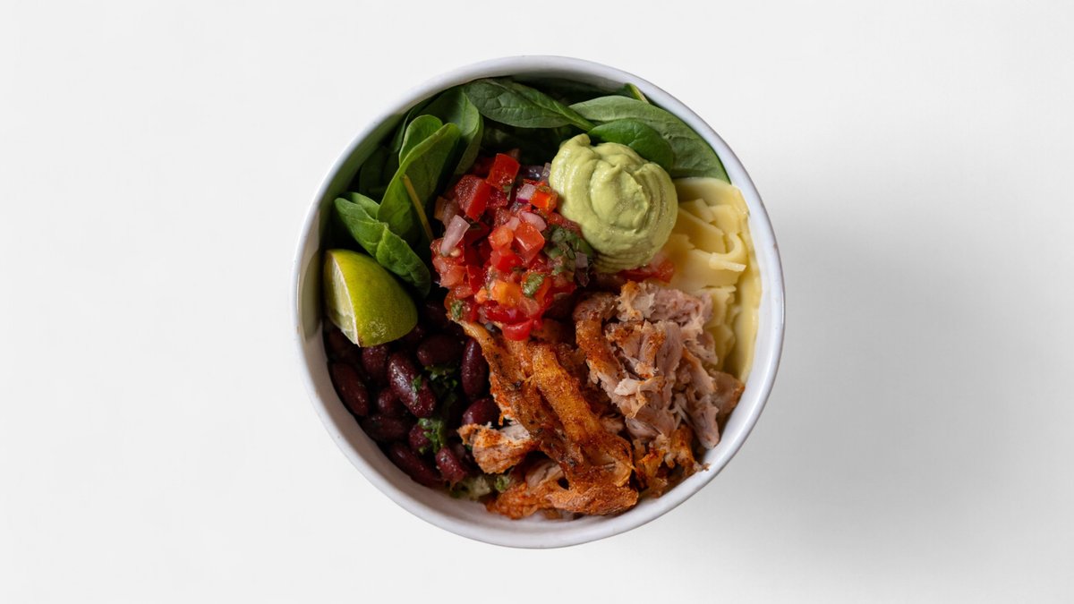 A bed of rice topped with spiced pulled chicken, roasted garlic mayo, avocado cream, kidney beans, cheddar and pico de Gallo salsa