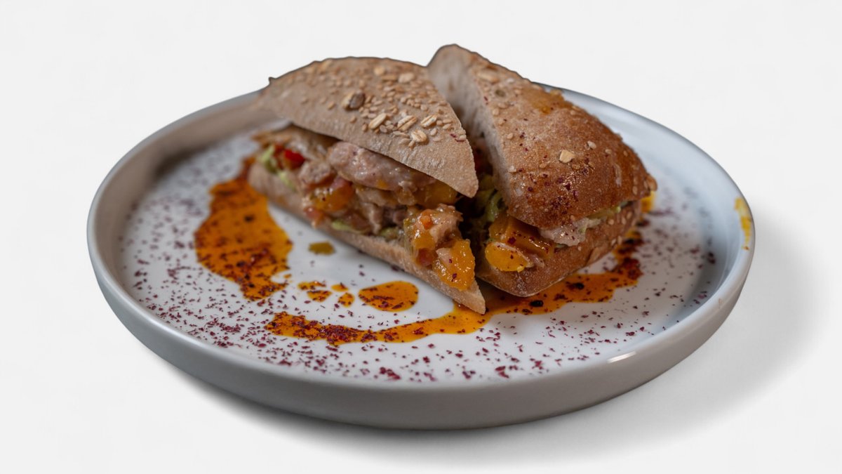 an avocado spread with a carribean style jersey chicken and a mango relish.