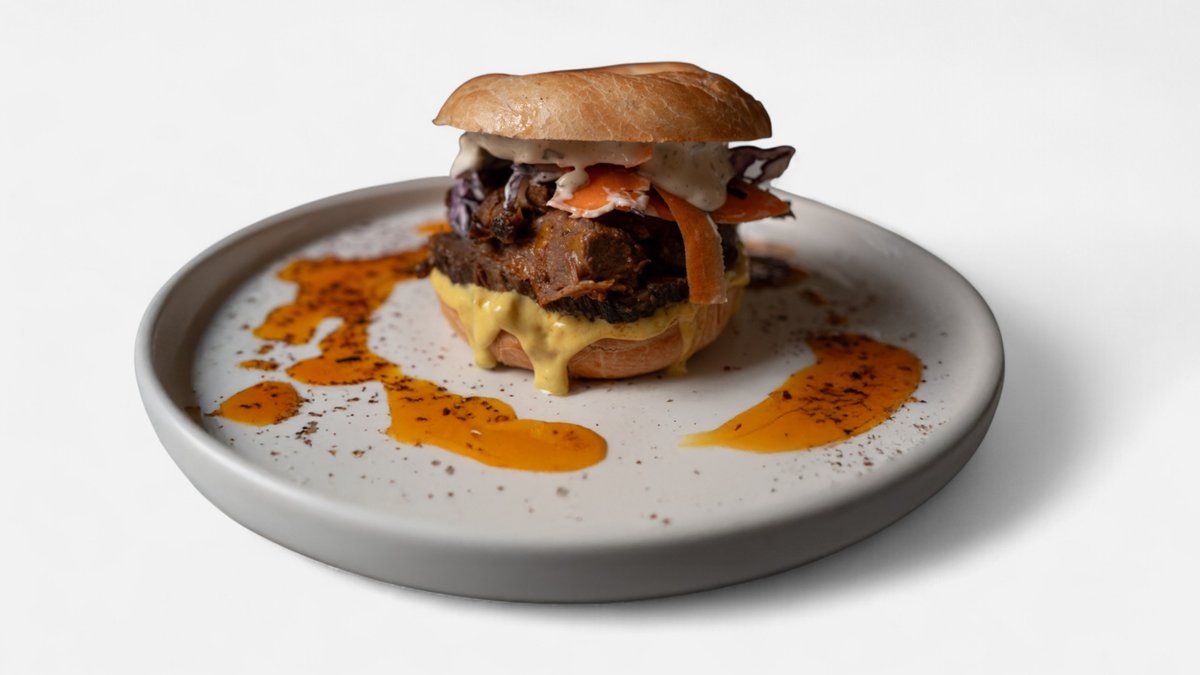 a slow cooked brisket with slaw, Coates garlic mayo honey mustard and a gherkin sauce