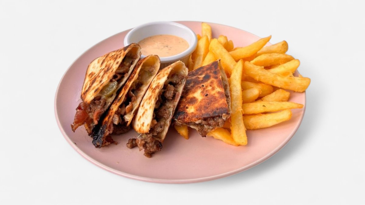 Golden crisp tortilla, Angus mince beef, Caramelized onions, Melted cheddar, Bacon bits, In house burger dipping sauce Served with fries