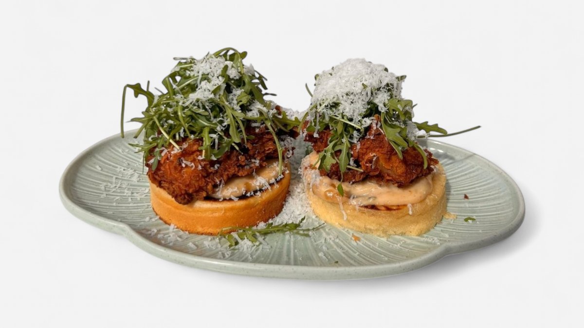Fluffy thick pancake, Buttermilk fried Chicken, Thighs, Mango Chutney aioli, topped with fresh rucola leaves & Pecorino