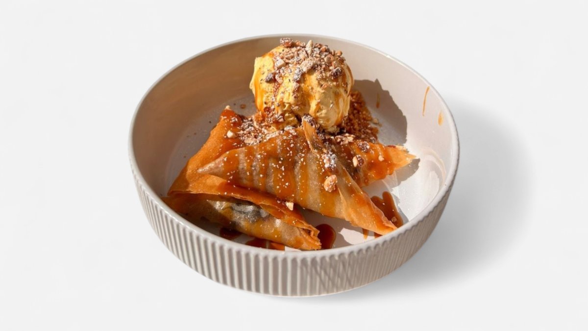Banana Chocolate Chip Filling, Vanilla ice, Cream, Salted Caramel dripping sauce, Powder sugar, Roasted Almond