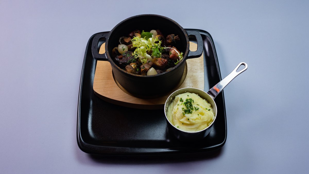 Slow cooked beef stew braised in red wine, bacon, mushrooms, chive pomme purée and red wine braising jus