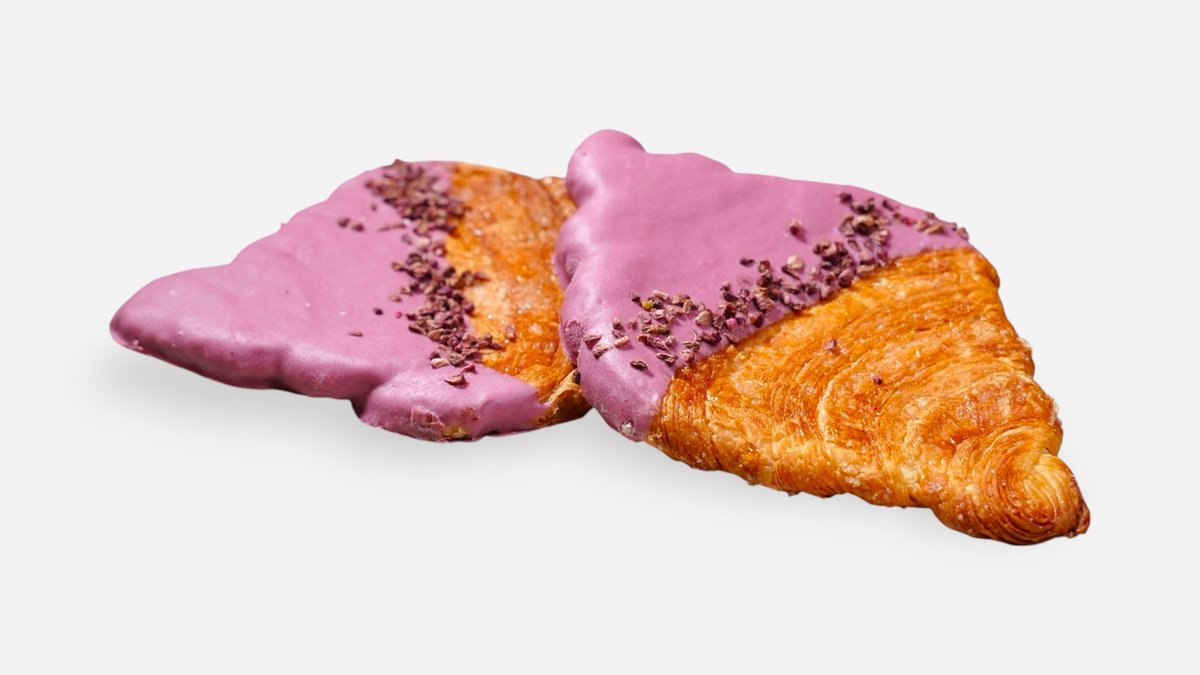 Buttery, flaky flat croissant dipped in ruby chocolate & topped with freeze dried raspberries