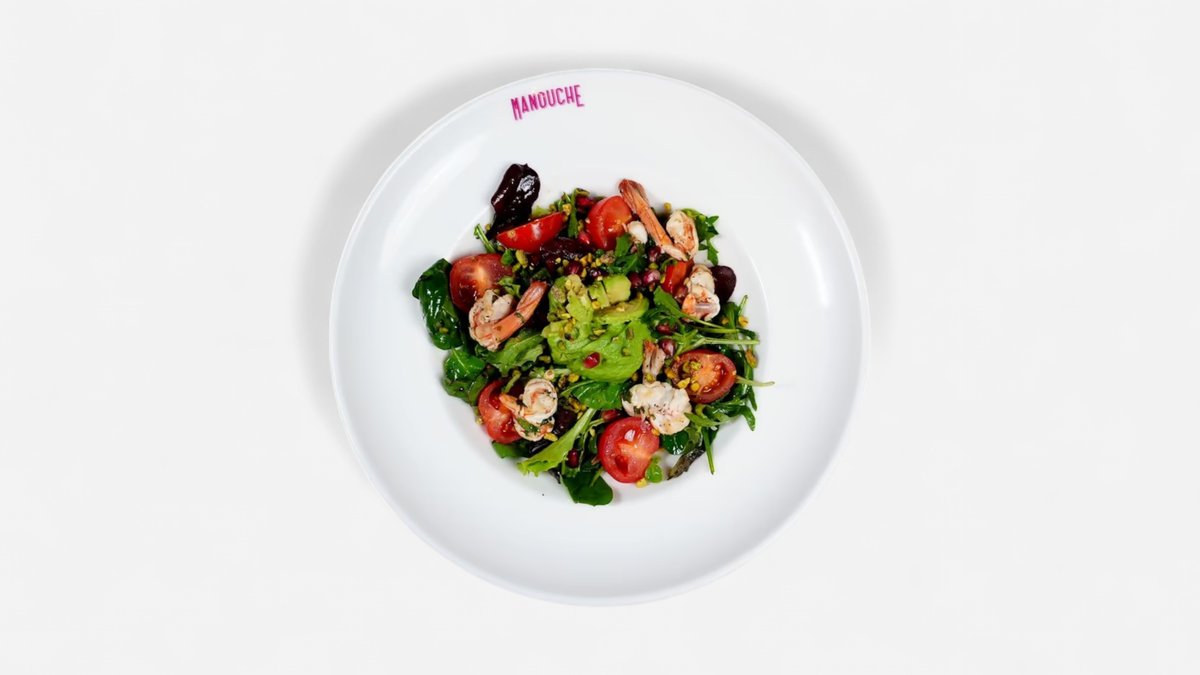 Marinated prawns, mixed salad leaves, avocado, pomegranate, rucola, cherry tomatoes, spring onions, crushed pistachios & lemon oil
