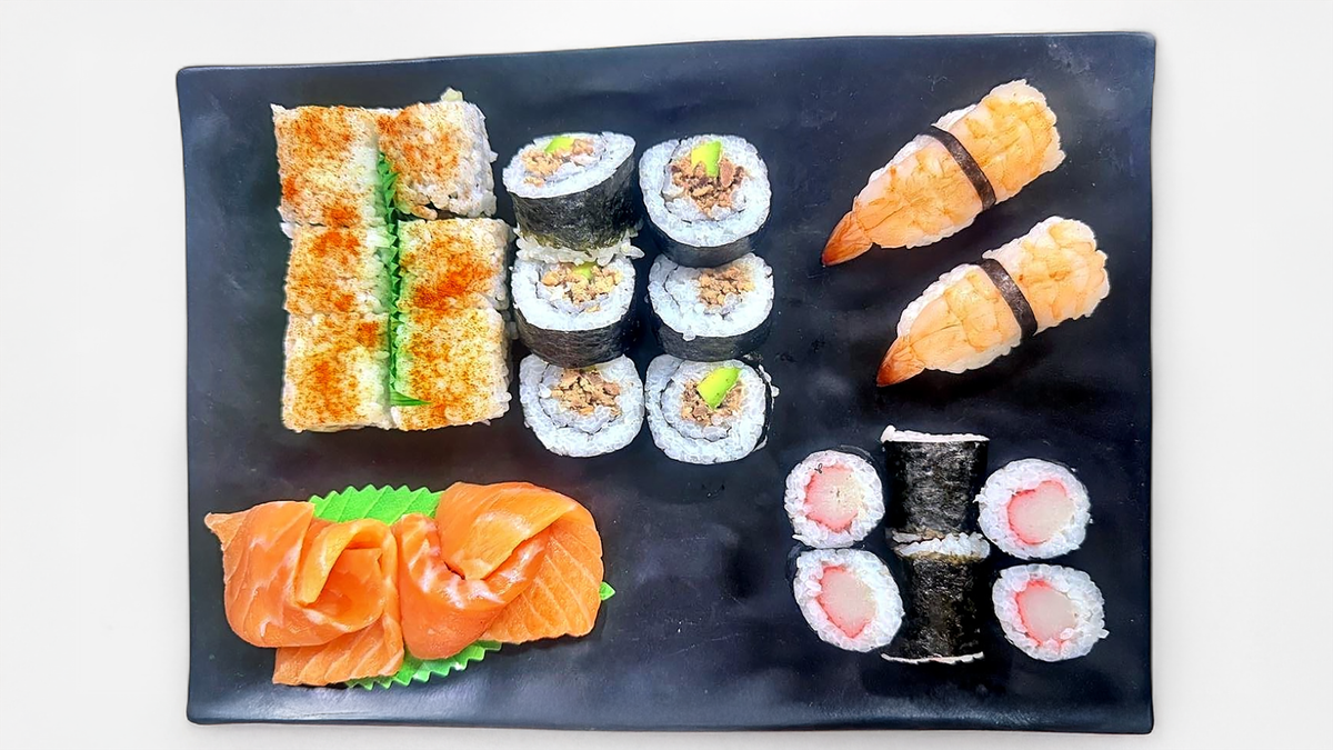 Includes: Prawn Nigiri, 2 pieces Fresh Spicy Salmon & Cucumber Roll, 6 pieces Family Style Tunamayo & Avocado Roll, 6 pieces Salmon Sashimi, 4 pieces Crab Roll, 6 pieces