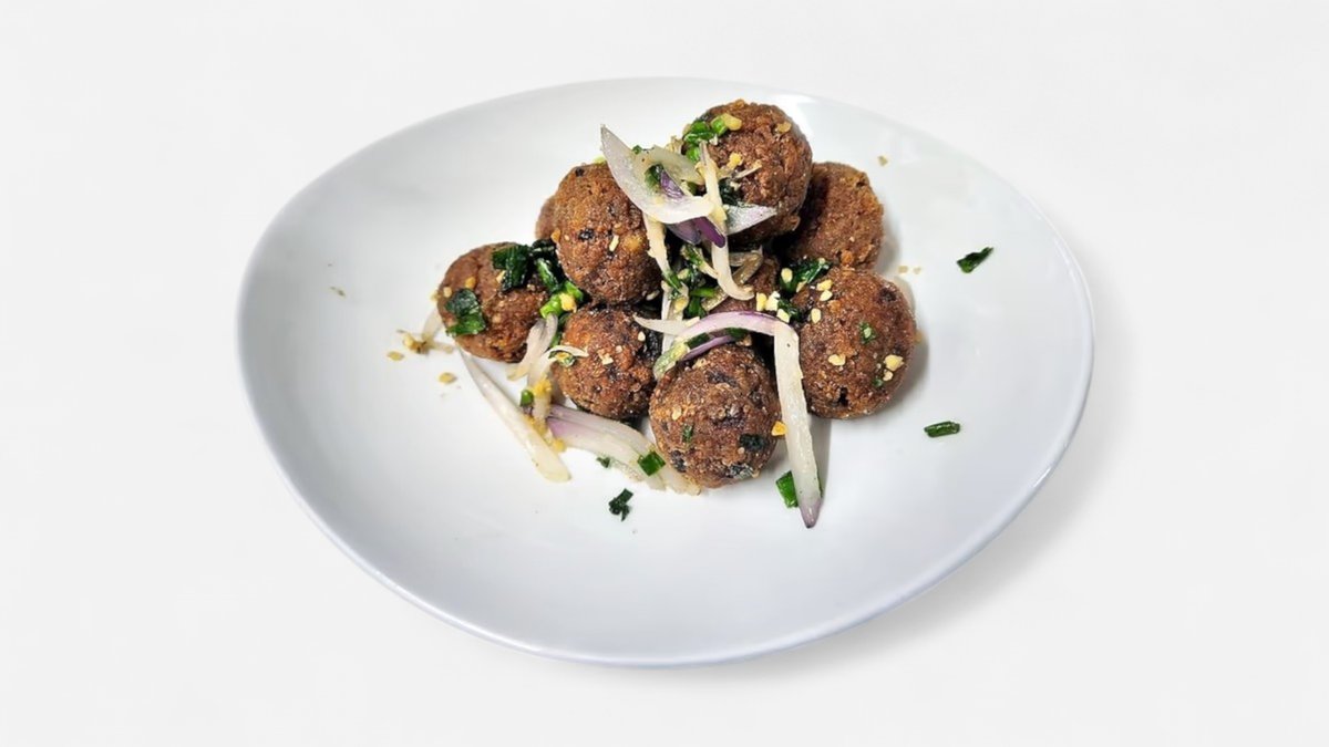 Fried meatball with salt pepper Onion, garlic, sspring onion.
