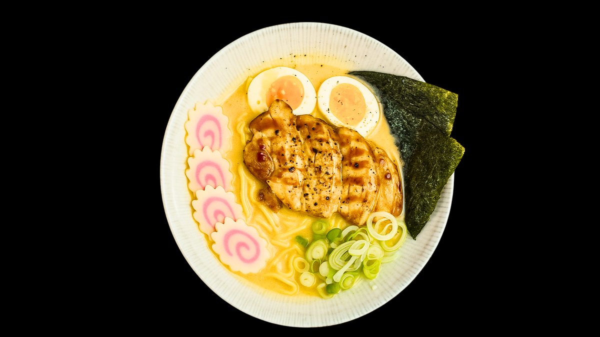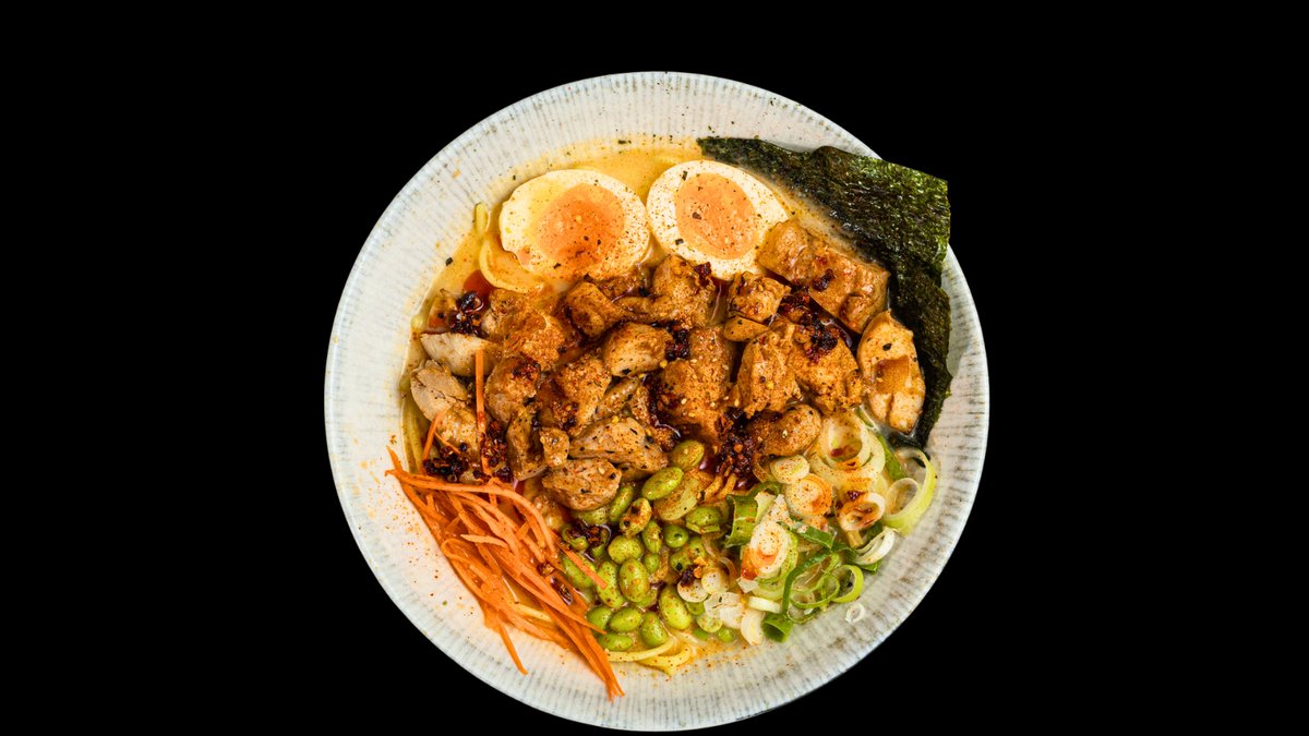 Choice of broth, chasu chicken, soft fried egg, green onions, ramen noodles, crispy chilli oil, edamame, furikake and nori