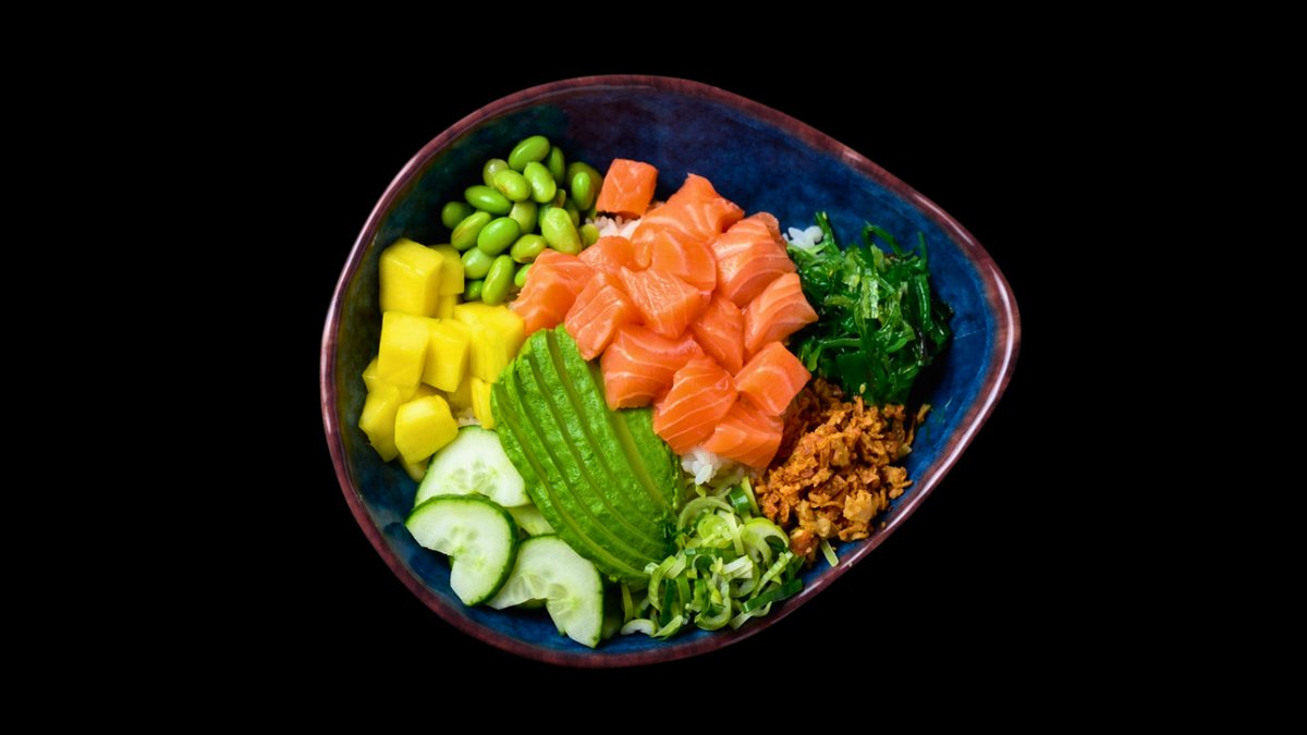 Sushi rice, salmon, avocado, cucumber, edamame, mango, spring onion, sesame, crispy onions, wakame and coriander sauce