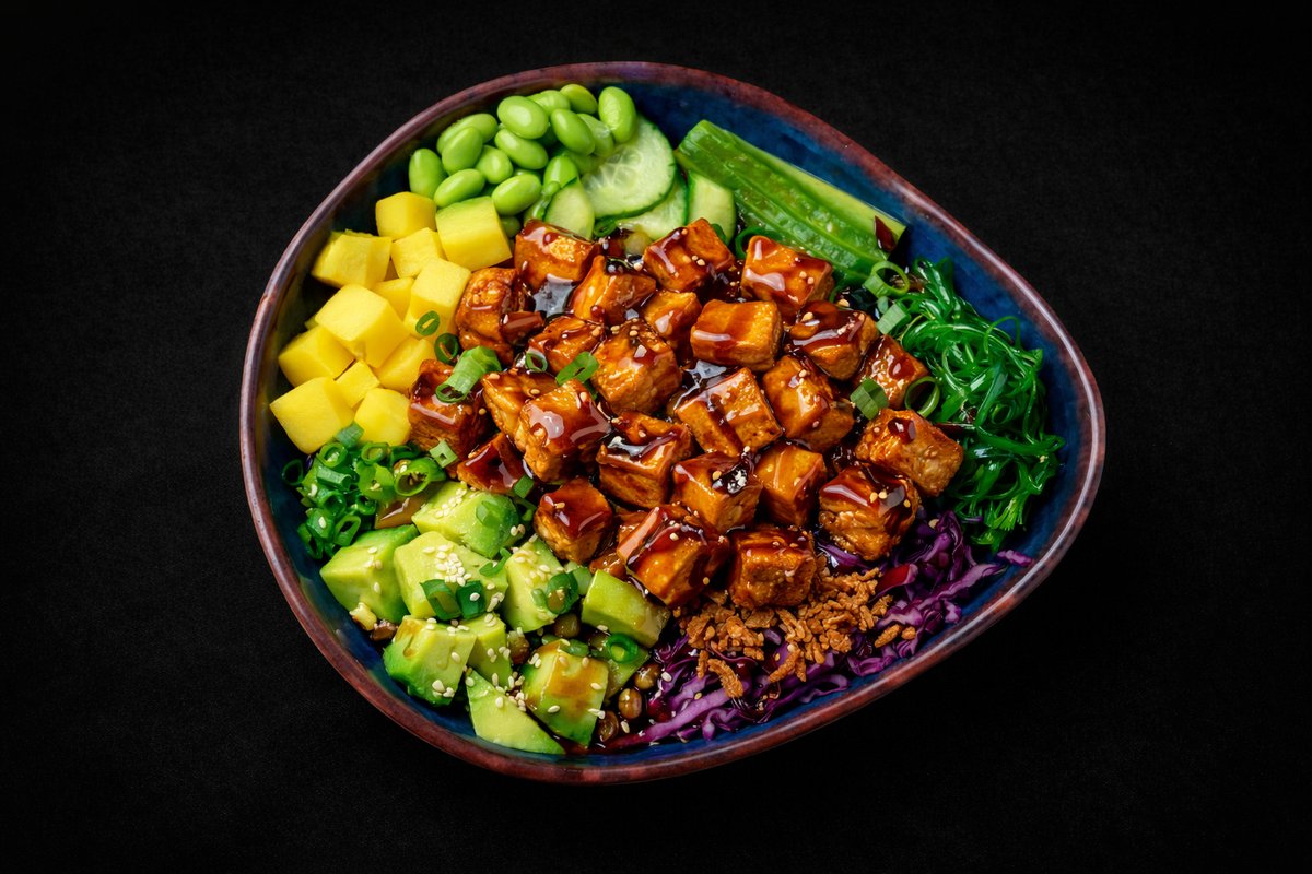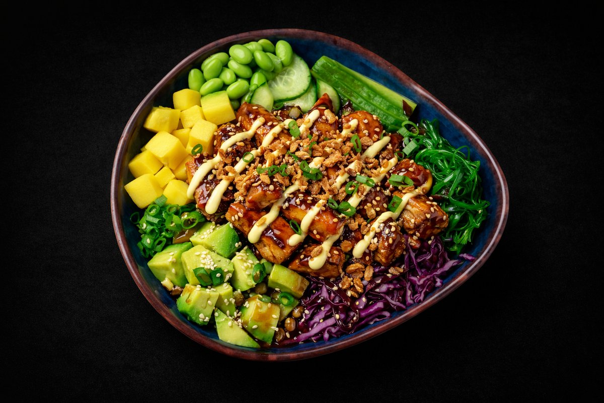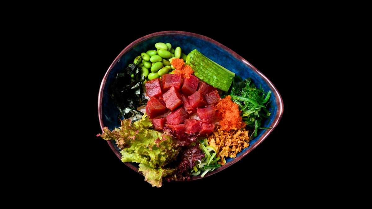 Sushi rice, tuna, avocado, cucumber, edamame, mango, spring onion, sesame, crispy onions, wakame, unagi sauce