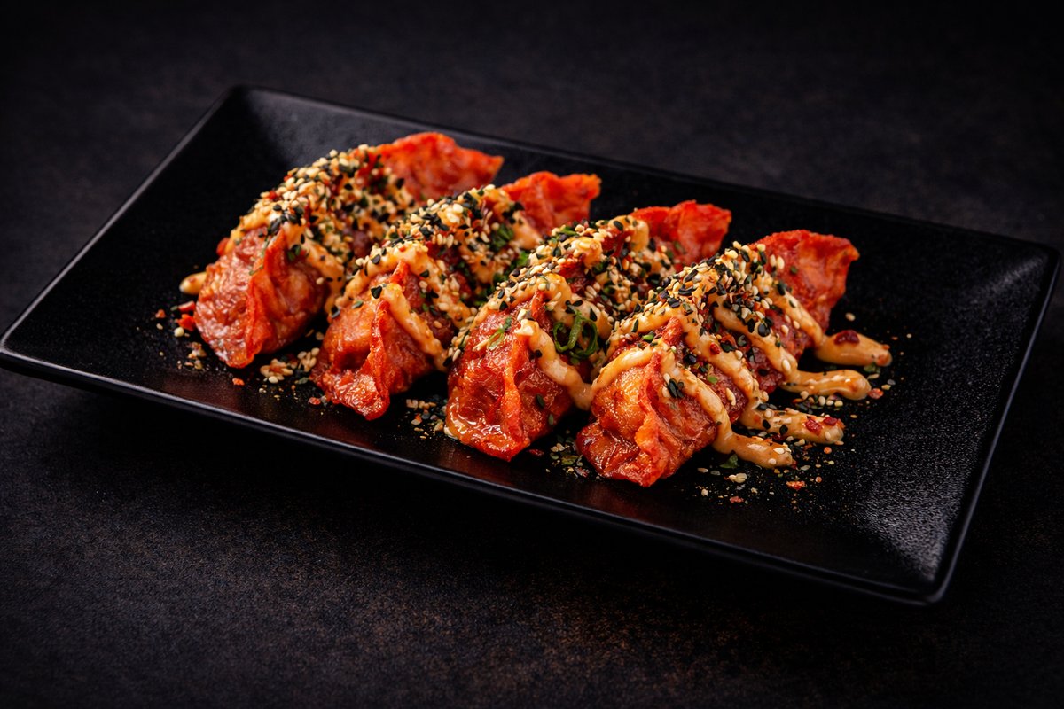 Chicken yakitori glazed with our spicy gochujang sauce, topped with furikake and green onion.