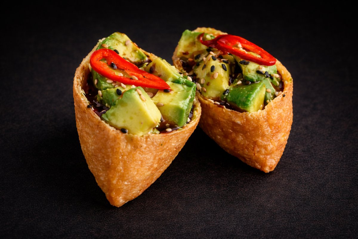 Vegan chicken, cucumber, avocado, tempura crumbs, teriyaki and vegan mayo