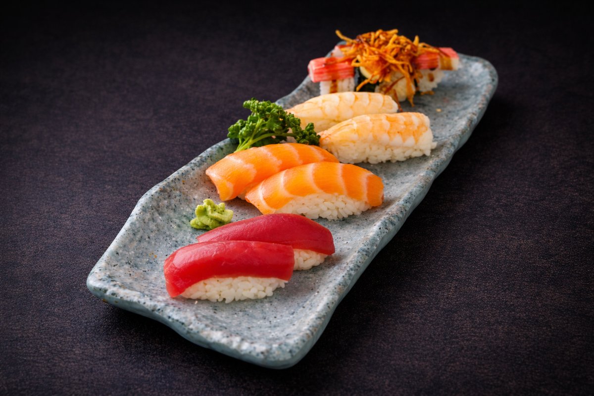 2 Pieces kani nigiri, 2 pieces salmon nigiri, 2 pieces ebi nigiri, 8 pieces california roll, 8 pieces salmon avocado roll