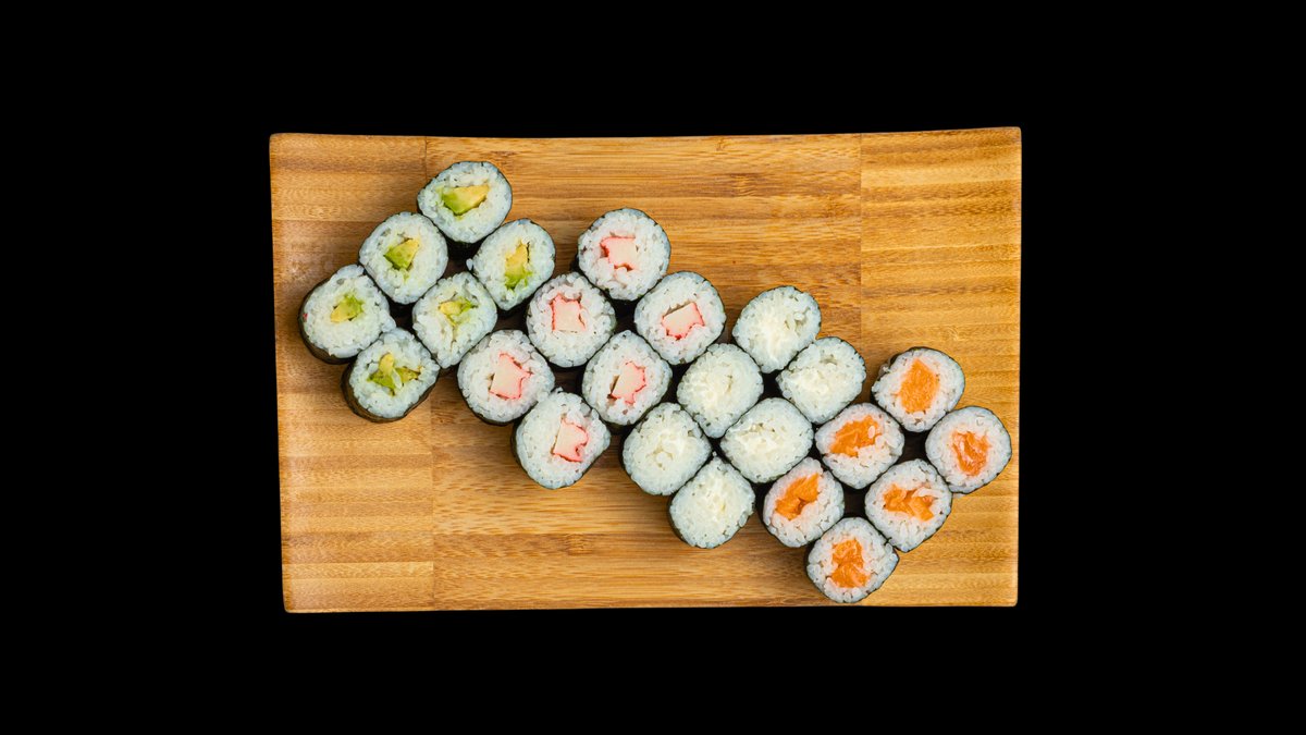 8 Pieces mori roll, 8 pieces tofu aburi roll, 6 pieces avocado hosomaki roll, 6 pieces kappa hosomaki roll,