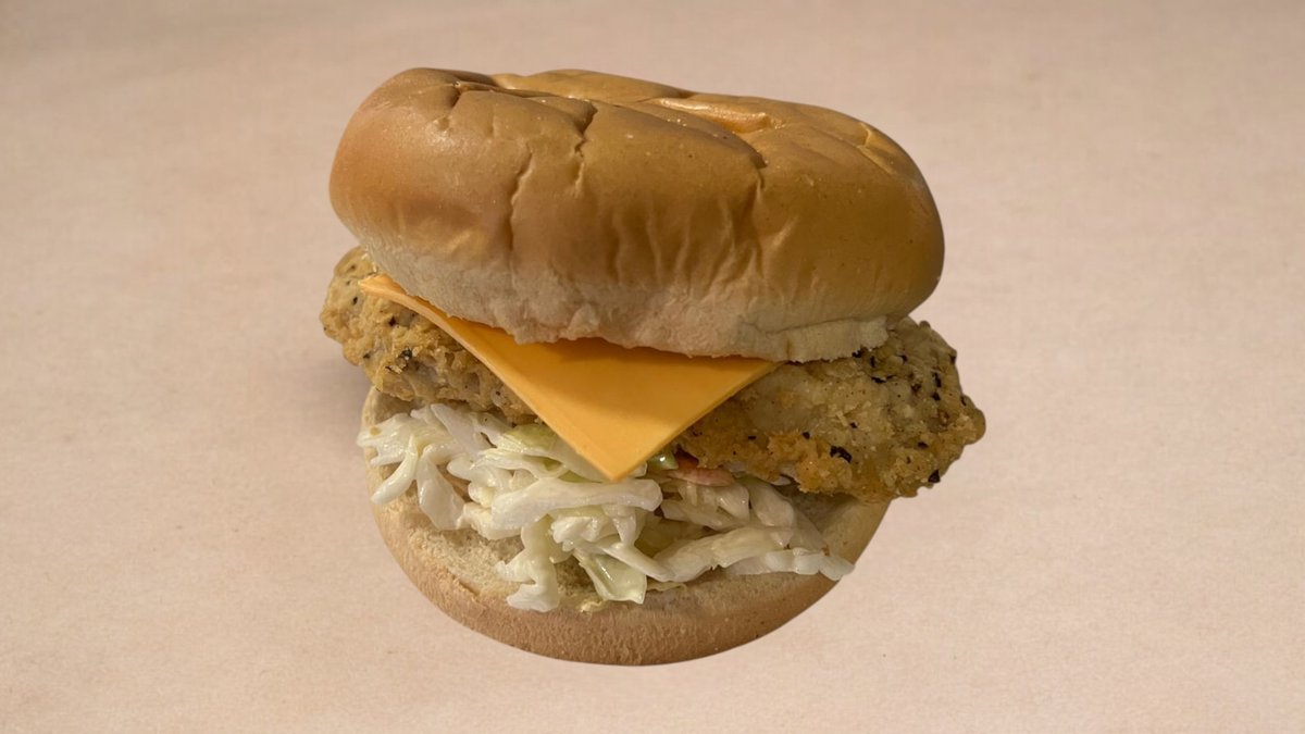 Braded chicken fillet in brioche bun with cheese and coleslaw