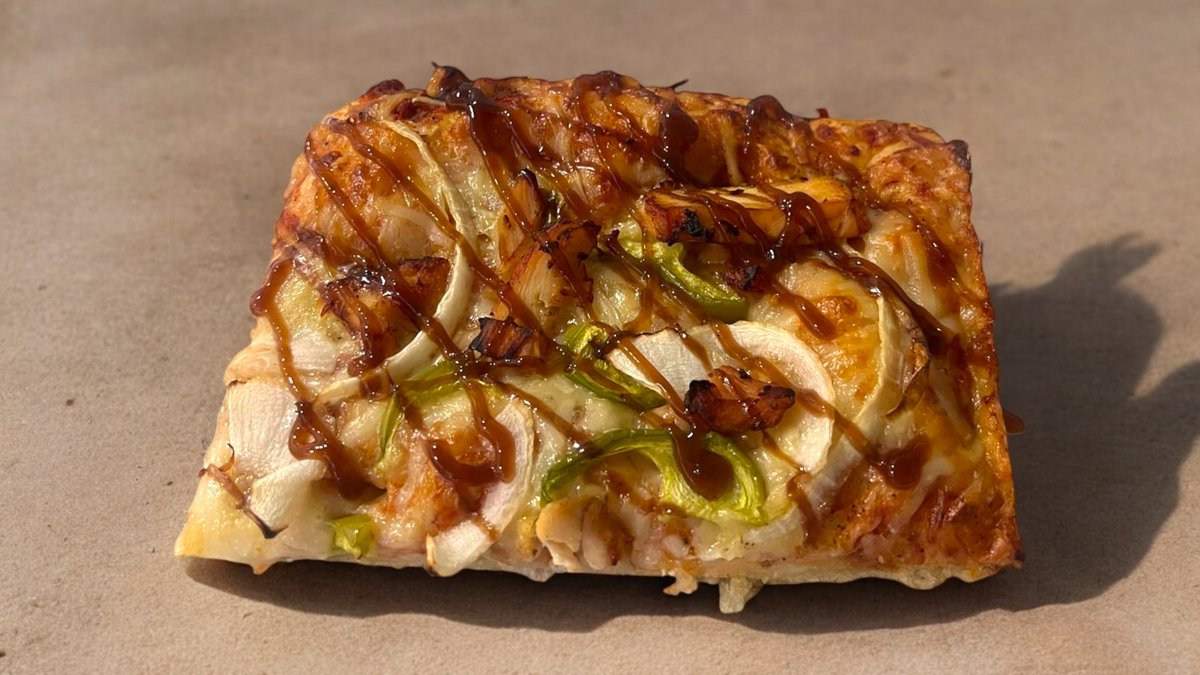 Freshly baked baguette with chicekn filet, lettuce, onion and BBQ sauce