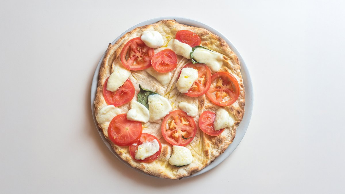 Focaccia with buffoalo mozzarella, sliced tomatoes, salt olive oli and origano
