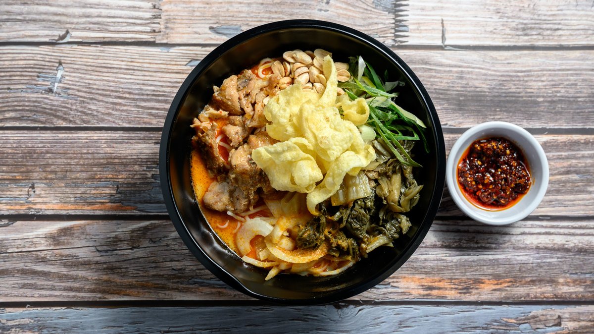 A Northern Thai classic—creamy coconut curry loaded with grilled chicken bites, pickled mustard greens, onions, and a splash of chili oil. Served over soft egg noodles, topped with crispy fried noodles and crushed peanuts for the perfect mix of texture and flavor.