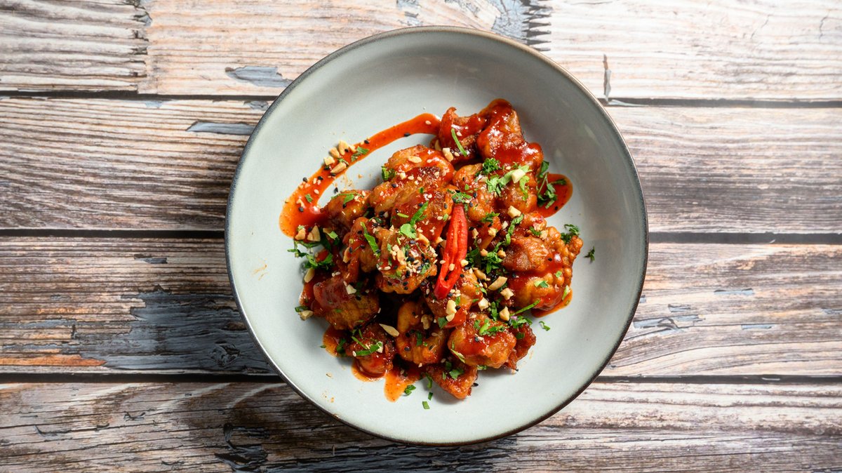 Spicy, double-fried crispy pork bites tossed in tangy sriracha sauce, finished with crushed peanuts, sesame seeds, fresh herbs, and spring onion—a bold bite with serious crunch