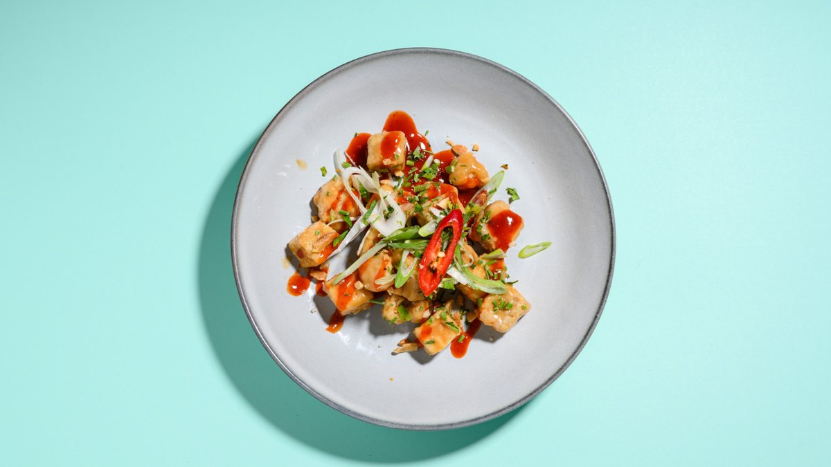 Our signature crispy korean fried tofu tossed in a Jajang sweet n' spicy sauce, topped with crushed peanuts, spring onion, mixed herbs