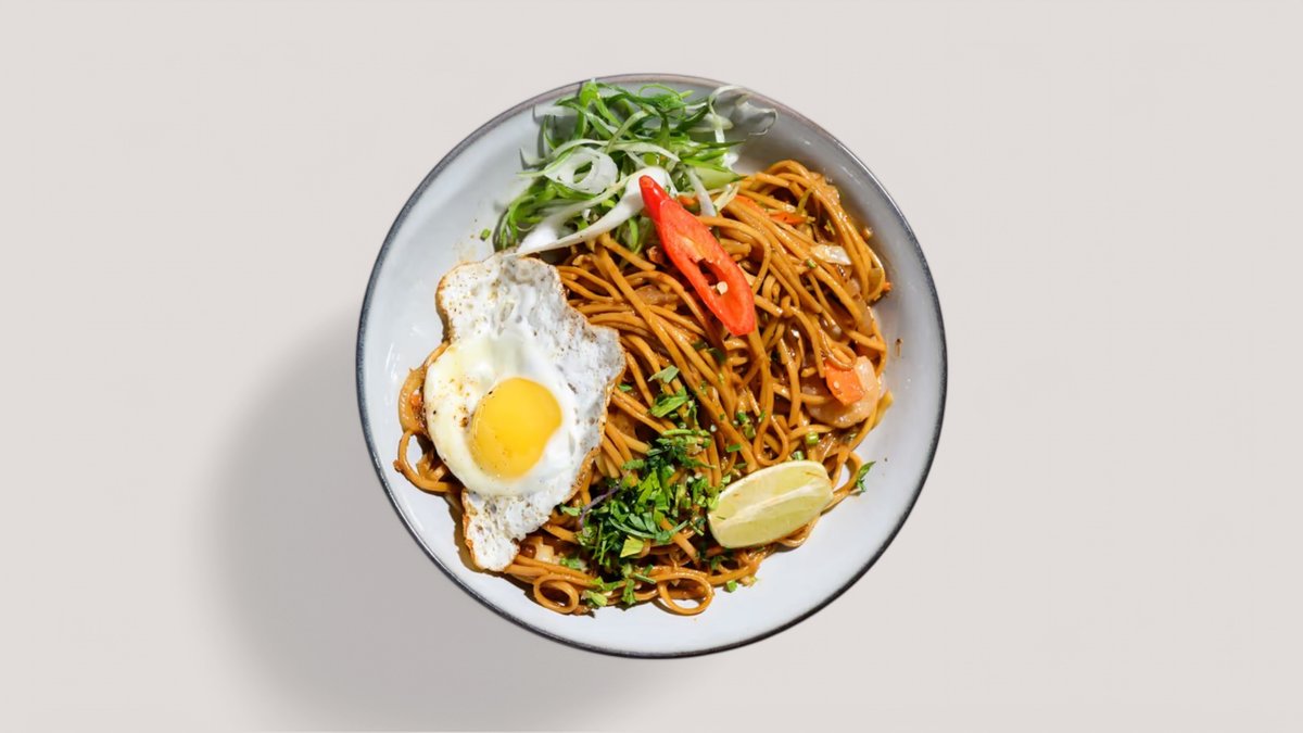 Wok-tossed wheat noodles with onion, carrot, and white cabbage, topped with a fried egg, spring onion, fresh chili, fresh herbs, and a wedge of lime—simple, vibrant, and packed with flavor