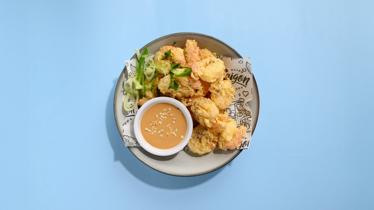 Cornflour-coated shrimp, perfectly seasoned and fried until crispy, finished with a squeeze of zesty lime for a bright, punchy twist, served with a sweet chili dipping sauce on the side