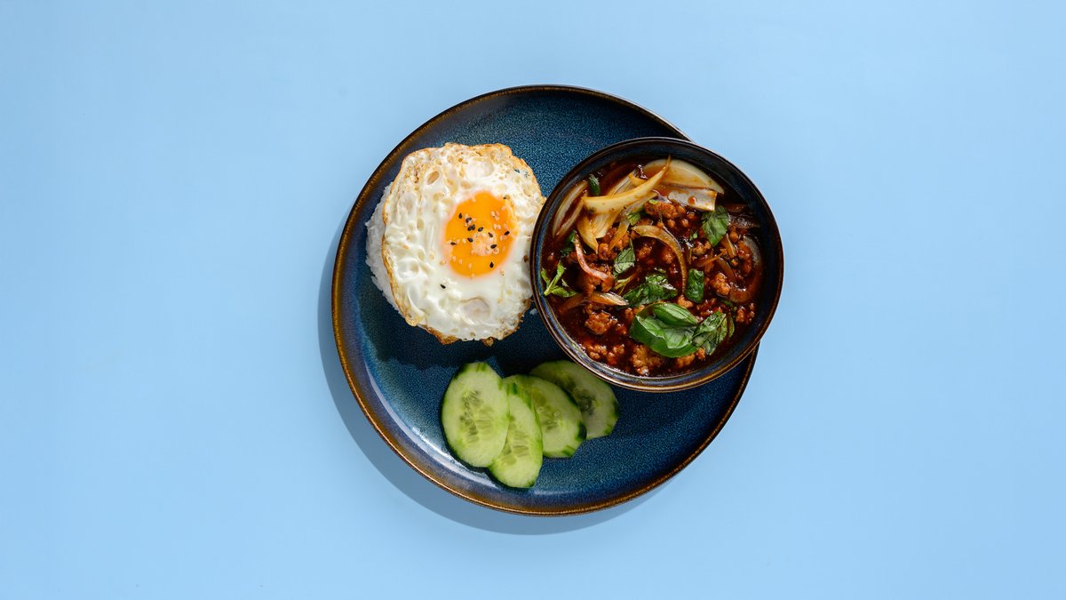 A staple Thai street food dish. Minced smokey pork with basil, onion and a sweet, slightly spicy sauce, topped with crushed peanuts, fresh chili, fresh lemon, steamed rice, fried egg and cucumber.