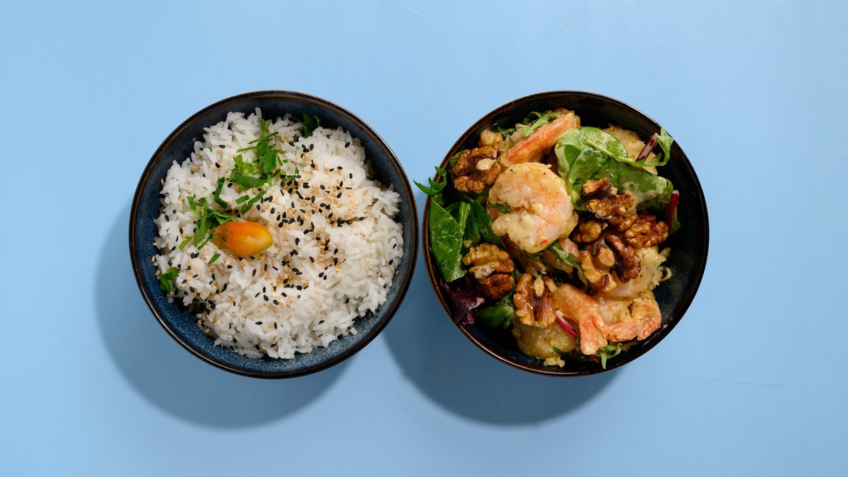 Crispy golden shrimp tossed with caramelized peanuts, fresh herbs, crunchy greens, and a zesty dressing-served with steamed rice on the side for a refreshing yet satisfying bite