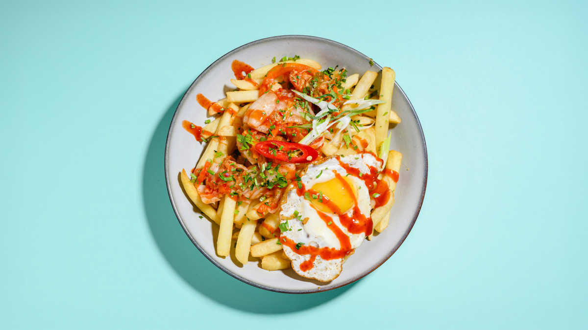 Crispy fries topped with crunchy sliced katsu chicken, drizzled with tonkatsu sauce and sweet chili mayo, spring onions, crushed peanuts, and fresh herbs