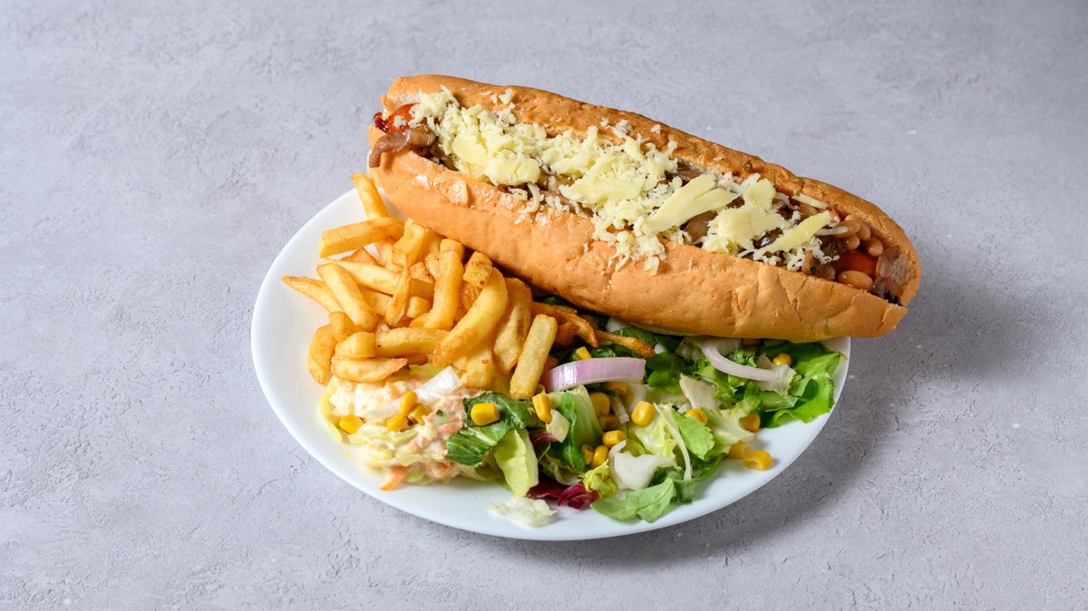 Frankfurter, onions, cheese and baked beans