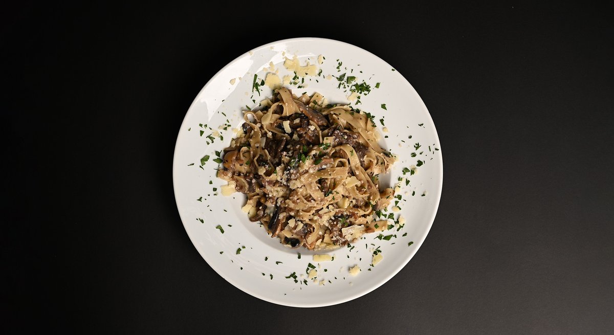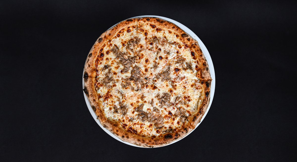 Homemade sauce, mozzarella covered with the ripest mushrooms around