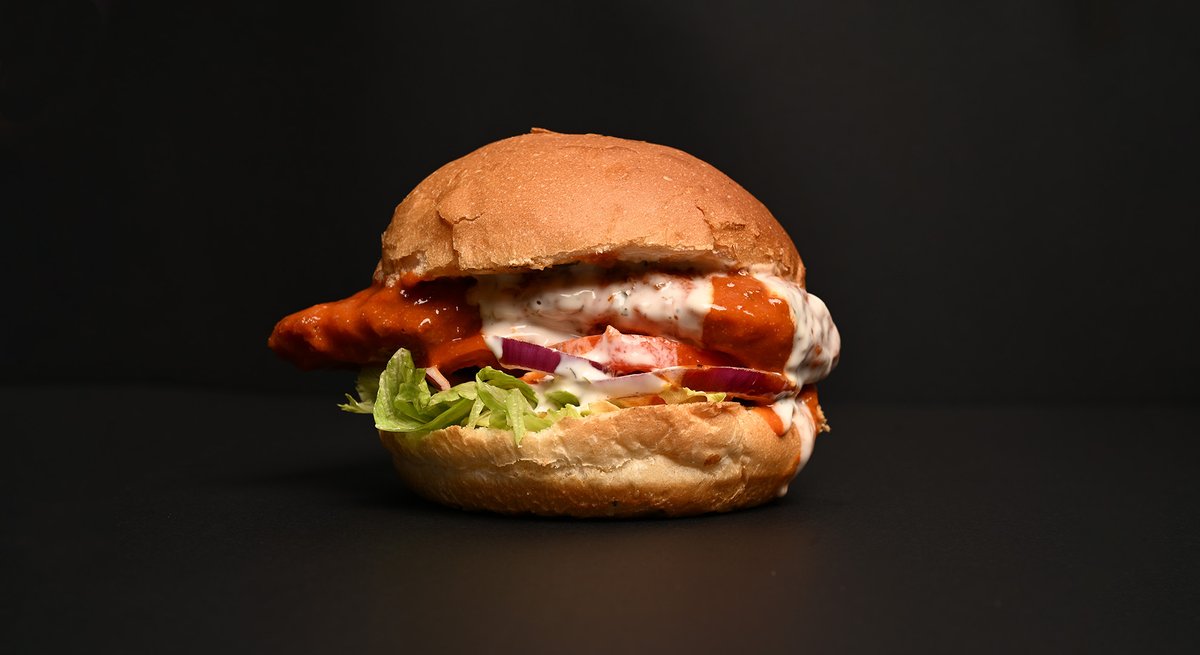 Couscous, sliced tomatoes, onions, spicy crispy chicken, lettuce and ranch dressing