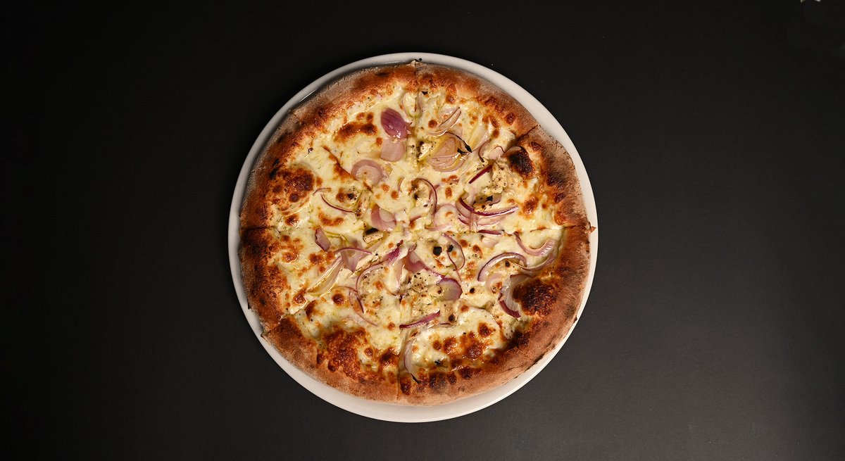 Homemade sauce, mozzarella covered with chunks of barbecue chicken, onions and mushrooms.