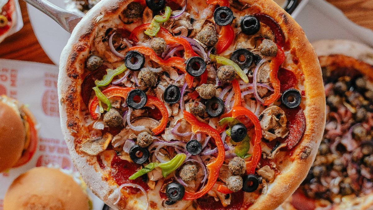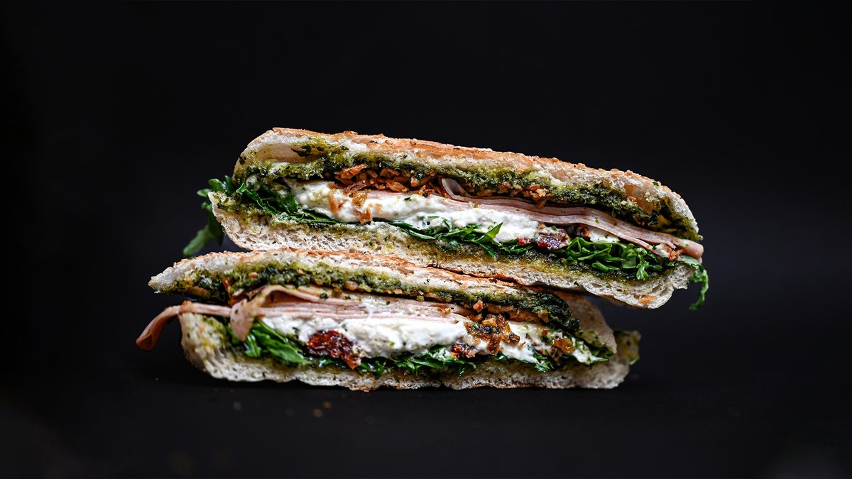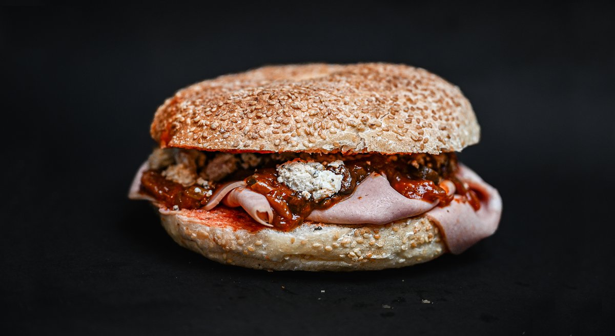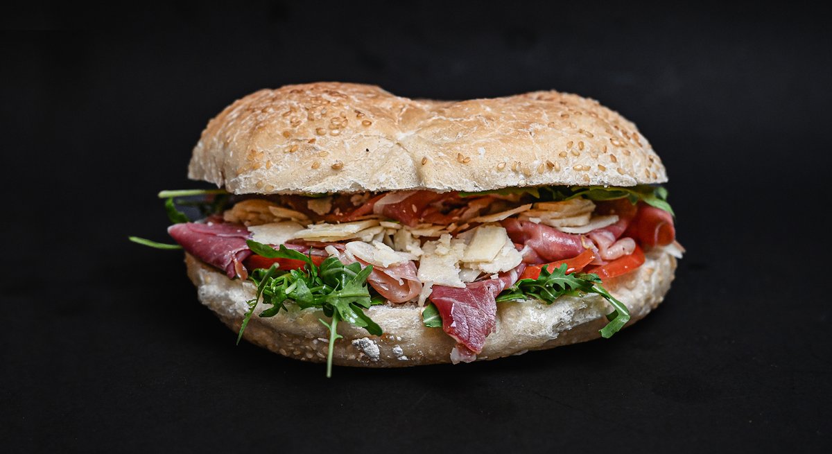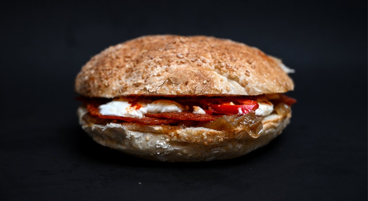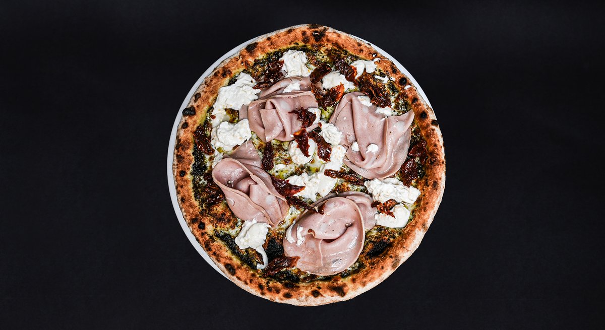 Homemade pesto, burrata, mortadella, rucola, sundried tomatoes and crispy onions