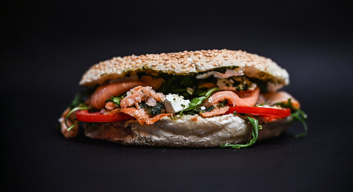 Homemade pesto, salmon, feta cheese, rucola and sliced tomatoes