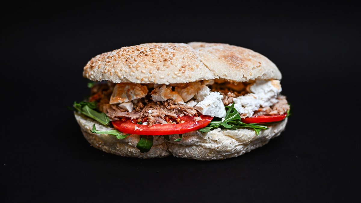 Red pepper and honey sauce, tuna, feta cheese, sliced tomatoes, crispy onions and rucola