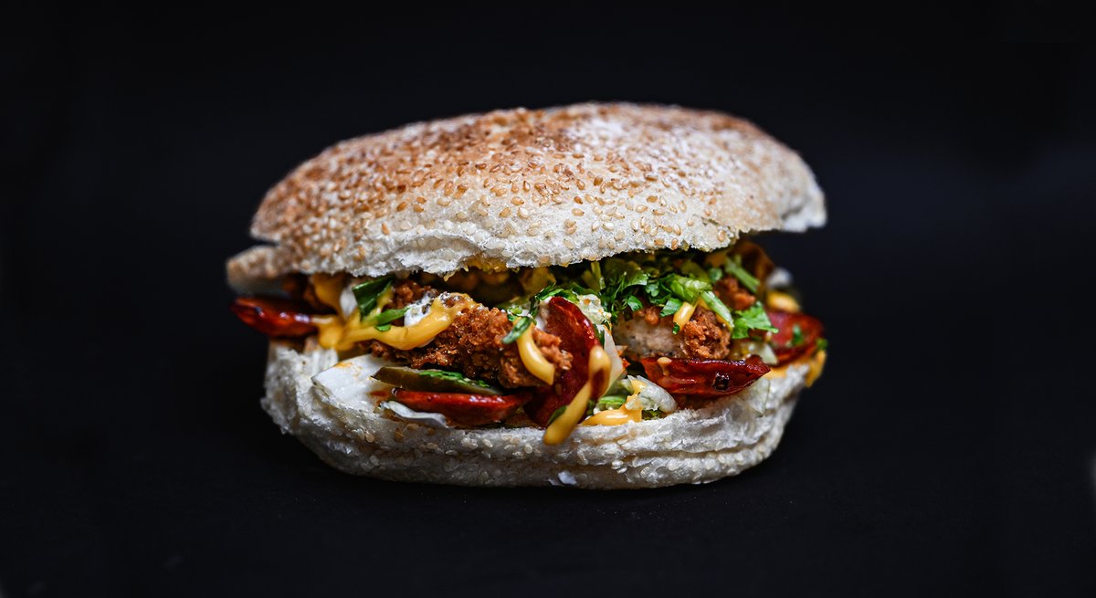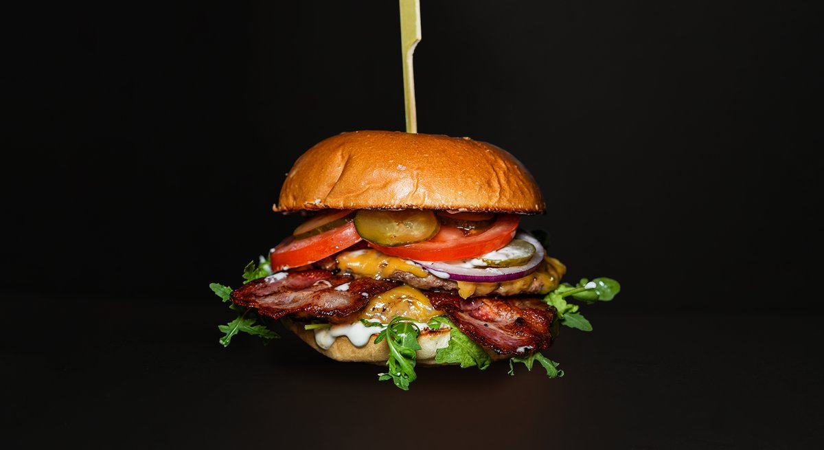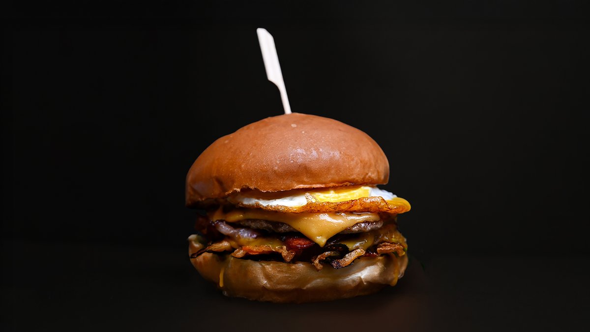 A double angus burger tucked in a brioche bun, two pieces of american cheese covered with streaky bacon, sliced tomatoes, onions, lettuce, pickles, ketchup, covered in our homemade relish. Served with fries