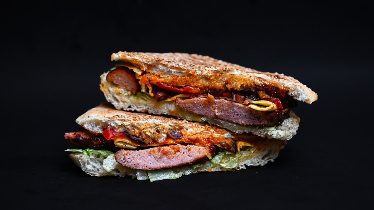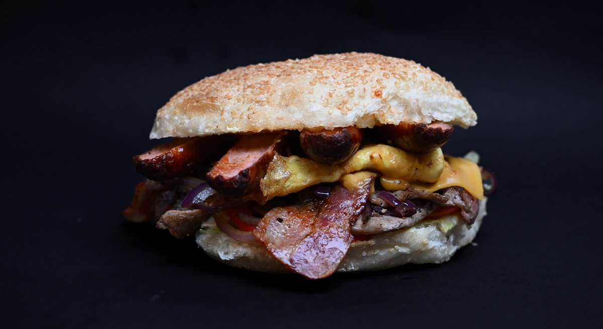 Fried egg, sliced beef, pork sausage, streaky bacon, cheese, cooked onions, sliced tomatoes, lettuce and ketchup
