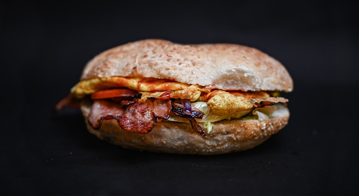 Fried egg, streaky bacon, cheese, cooked onions, sliced tomatoes, lettuce and ketchup