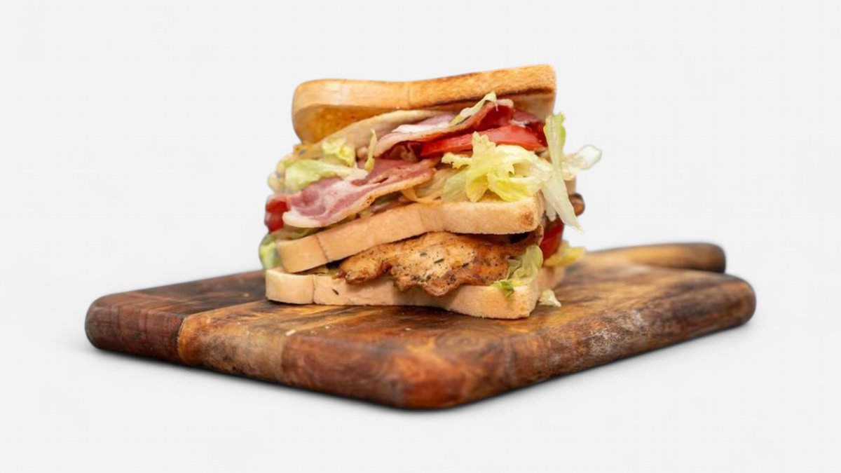 A three layer toast filled with chicken, bacon, fried egg, lettuce, tomatoes and mayo