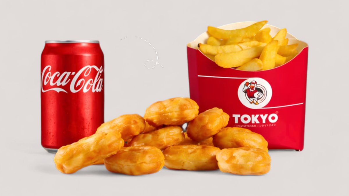 6 crispy chicken nuggets, 3 hot chicken wings, 3 juicy chicken strips, along with one ketchup and mayonnaise dips.