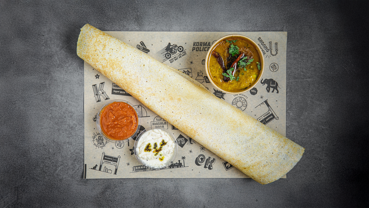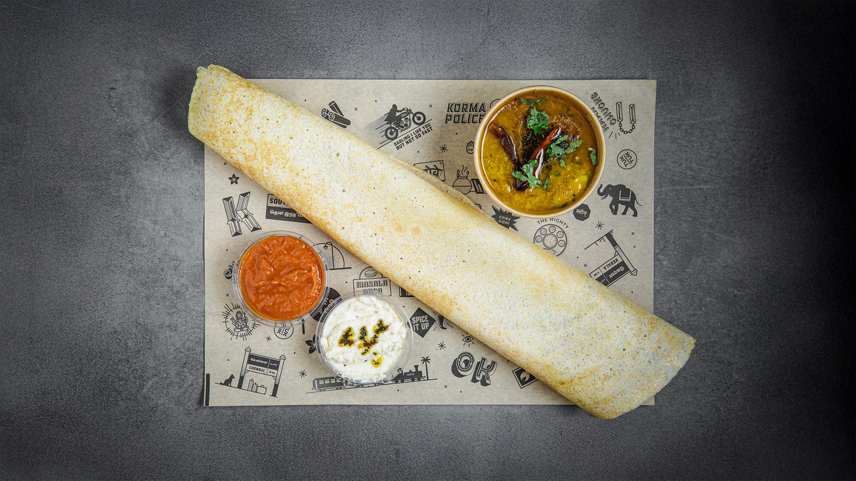 A classic mashed spiced potato & onions filled dosa. Sambar, Tomato chutney & coconut chutney.