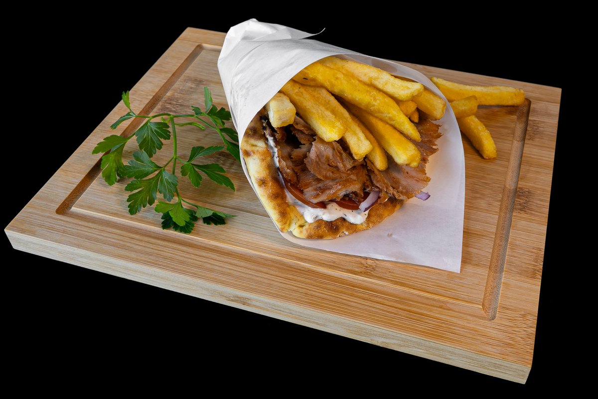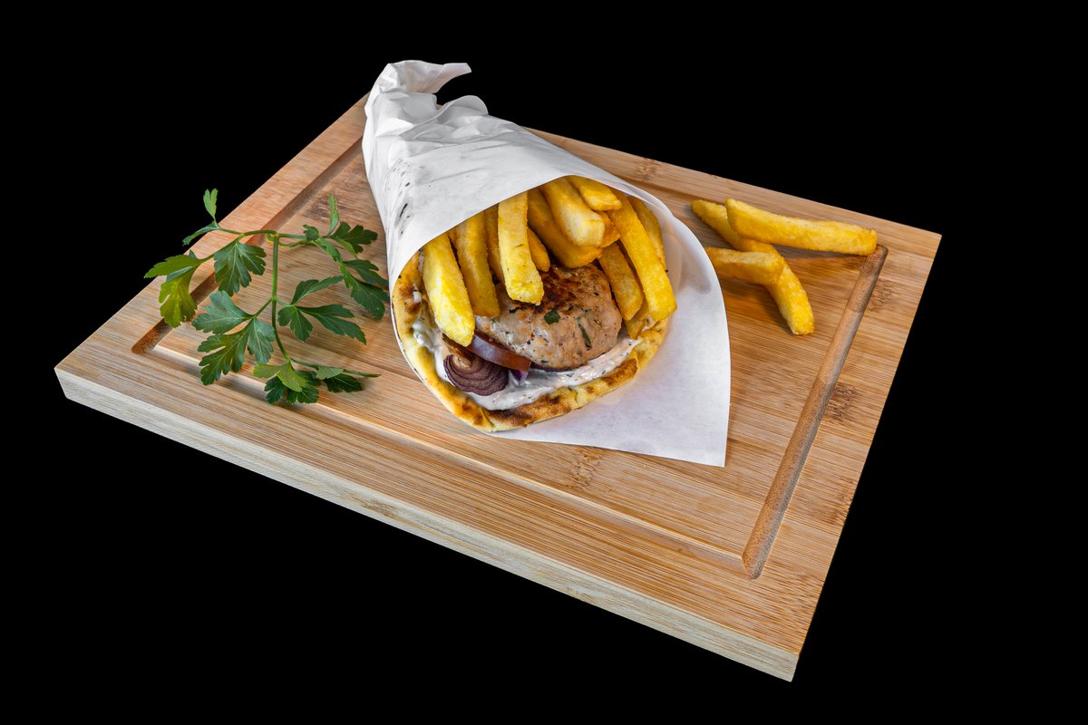 Extra-Large pita bread filled with juicy pork or chicken wrapped in fluffy pita, loaded with fresh veggies, crispy fries & creamy tzatziki — the perfect Greek bite!