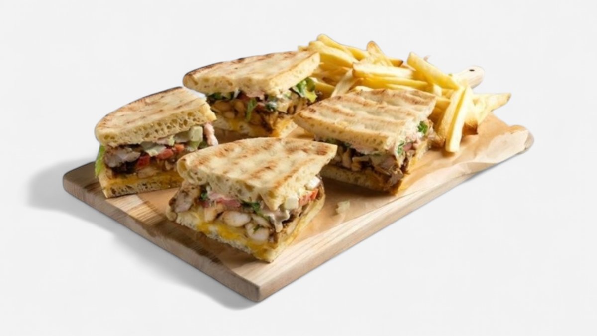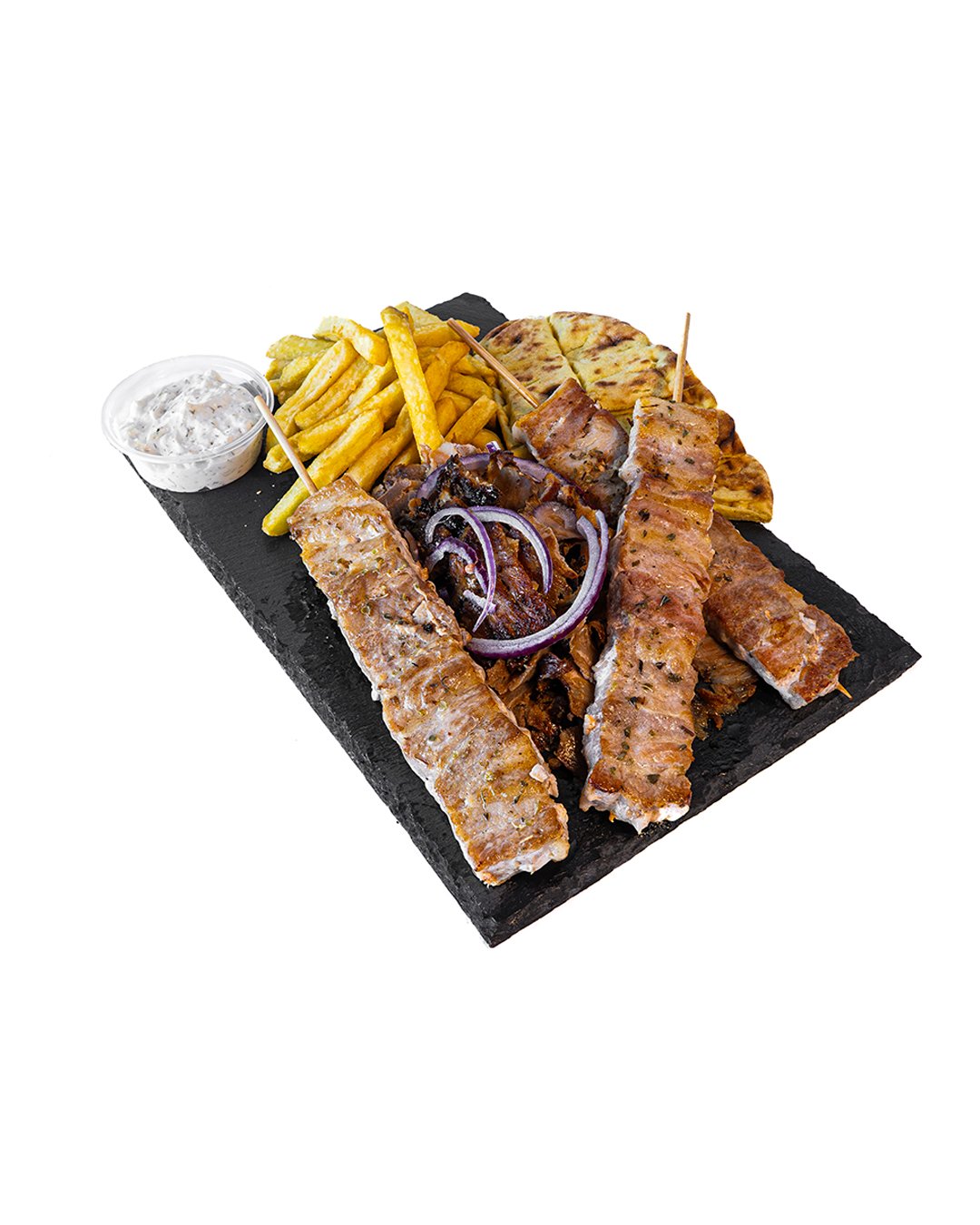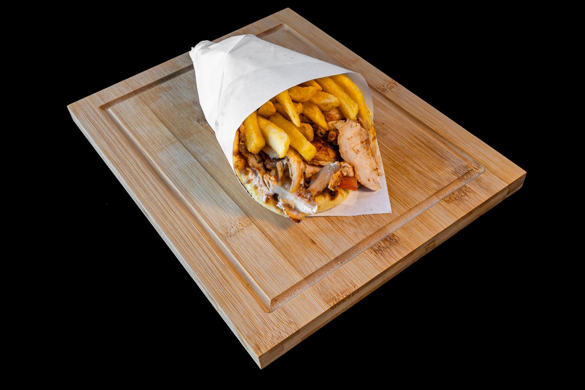 Two grilled pita breads filled with juicy pork or chicken, cheese , crispy fries , tomatoes , and our signature sauce — like a Greek-style club sandwich!