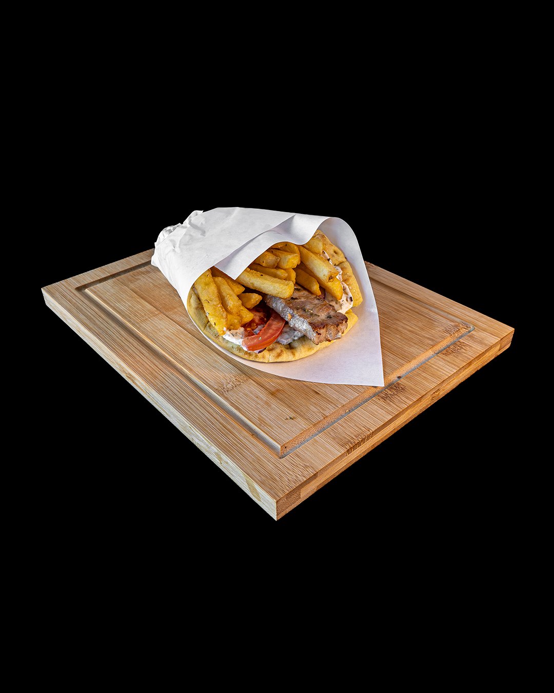 Grilled chicken skewer wrapped in warm pita with fresh tomatoes, onions, crispy fries, and creamy tzatziki-— pure Greek goodness in every bite!